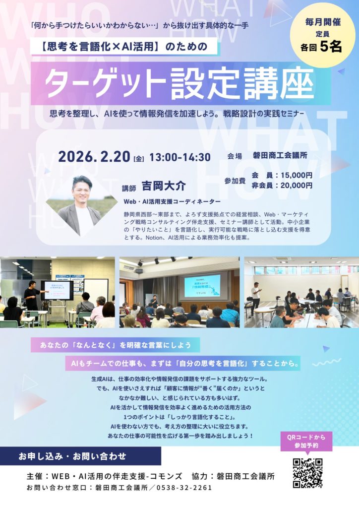 | タイトル | 思考を言語化×AI活用のためのターゲット設定講座 – who what howのワーク |