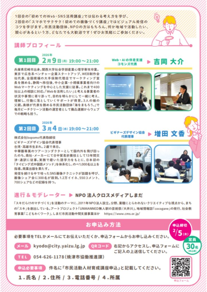 | タイトル | 初めての Web・SNS活用講座 ~ 基礎から学ぶ「伝わる」情報発信の考え方~ |