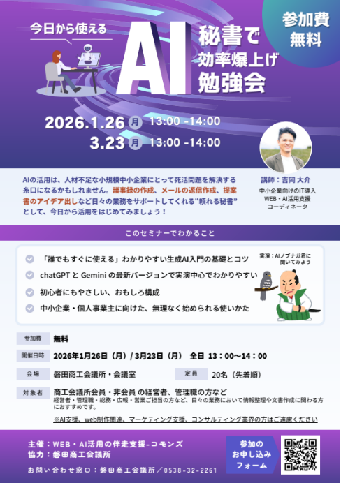 | タイトル | 【参加無料】今日から使える AI秘書で効率爆上げ勉強会 |